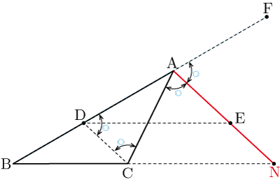線分 と平行で点 を通る直線と辺 との交点を点 とする.点 を通り辺 に平行な直線と線分 との交点を点 とする.辺 の延長線上に図のように点 をとる.