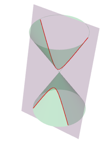 円錐曲線(双曲線) 円錐切断面は対の円錐の両方の母線と交わる