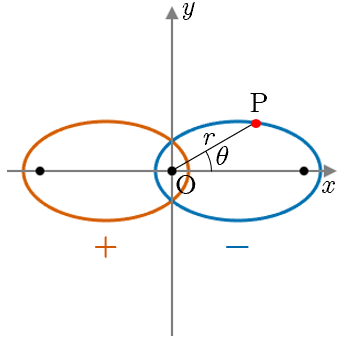 楕円(横長) 極方程式の分母2項目の符号が+なら右 の焦点,ーなら左の焦点が原点となる