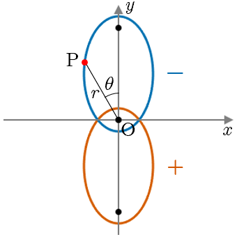 楕円(縦長) 極方程式の分母2項目の符号が+なら上 の焦点,ーなら下の焦点が原点となる