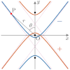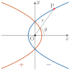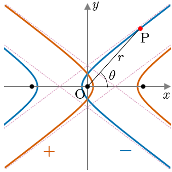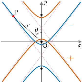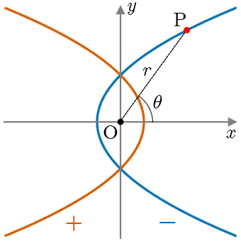 双曲線(横向き) 極方程式の分母2項目の符号が+なら左 の焦点,ーなら右の焦点が原点となる
