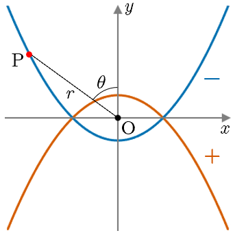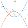 放物線(縦向き) 極方程式の分母2項目の符号が +なら上に凸,ーなら下に凸となる