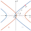 双曲線(縦向き) 極方程式の分母2項目の符号が+なら下 の焦点,ーなら上の焦点が原点となる