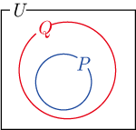 命題が取り扱う要素の全体集合を , 条件 を満たす要素すべてを含む集合を ,条件 を満たす要素すべてを含む集合を とする. , は の部分集合になる.