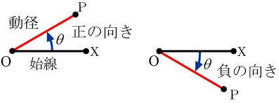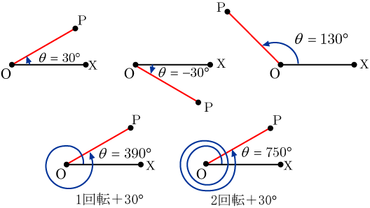 平面上に点 O からのびる半直線 OX と OP があり, OX と OP が重なった状態から, O を中心として OP が平面内である角度回転して静止したとする.回転方向は,半時計回りを正の向き,時計回りを負の向きとする. OX と OP のなす角度は,回転量とその方向で決まる.そこで OX と OP のなす角度(∠ XOP )を OP が回転した角度で表したものを一般角と定義する. OX を始線, OP を動径という.