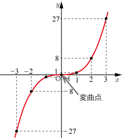 増減表とグラフより,極値は存在せず,変曲点は 0,0 であることが分かる.