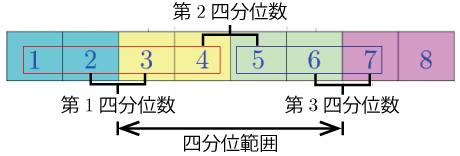 四分位数(しぶんいすう)の範囲は第1四分位数から第3四分位数の範囲である.