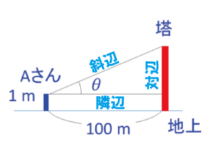 直角三角形の各辺を図のように名前をつける.問題では隣辺の長さが100mと定められている.求めるのは塔の高さで,塔の高さは「対辺の長さ+1m」である.提示されている三角関数 sinθ=対辺斜辺, cosθ=隣辺斜辺, tanθ=対辺隣辺, の内,隣辺と対辺に関係しているのは tanθ である.