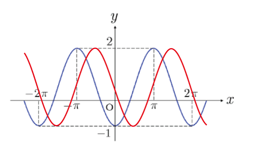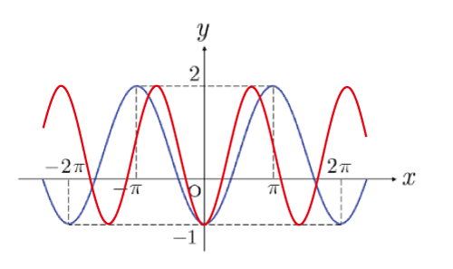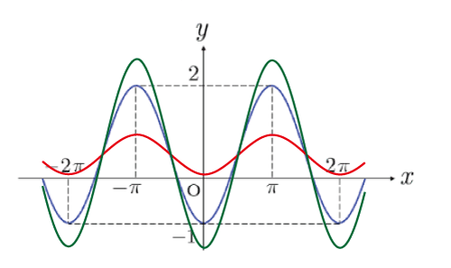 aを変更するとサインのグラフの振幅が変化する.緑色のグラフはaの値を増加させた場合で振幅が大きくなる.赤色のグラフはaの値を減少させた場合で振幅が小さくなる.aがある値より小さくなるとx軸と交わらなくなる。