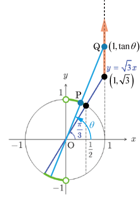 点Pが緑色の部分を移動すると点Qも移動し,その時の点Qのy座標の値 tanθ は