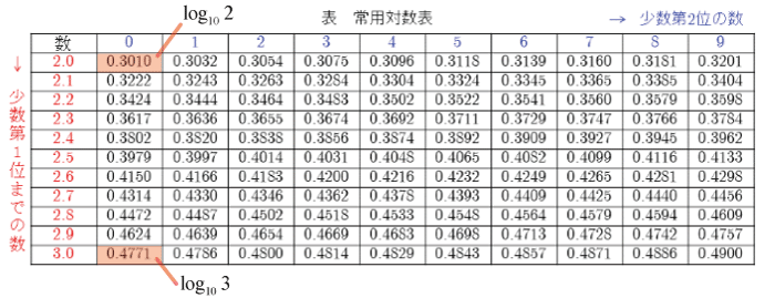 提示された常用対数表では log 10 2 から log 10 3 の間の常用対数しか求めることはできない.そのため log 10 6 の値を直接もとめることができない.よって,対数の計算則を用いて