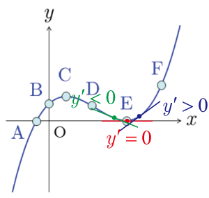 また,点Eの近傍では,xの値が増加すると,接線の傾きが増加している.言い換えると, y ′ <0 , y ′ =0 , y ′ >0 となり, y ′ が増加している.すなわち,点Eでは, y ″ >0 である.グラフの凹凸を参照.