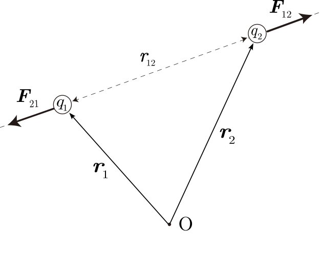 と表すことができる(図は電荷が同符号の場合).ここで, は電荷間の距離, は電荷 から電荷 に向かう方向を持つ単位ベクトルである.また,(1)式の は比例定数であり,真空中では真空の誘電率 を用いて で与えられる.