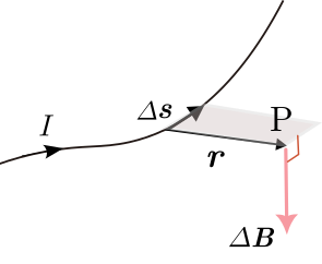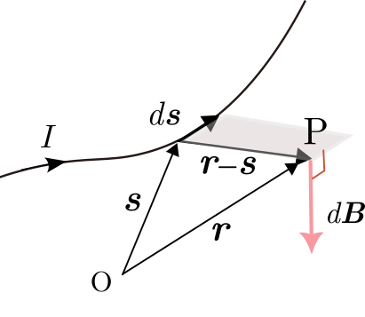 で与えられる.ここで, は微小区間 を原点としたときの点 の位置ベクトル, , は真空の透磁率である.(1)式は,ビオ・サバールの法則と呼ばれる.