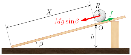 図1のように,質量 ,半径 の一様な剛体とみなせるボールが,初速ゼロで水平面とのなす角 の粗い斜面上の点 から滑らずに転がり落ちる.斜面に沿って下向きに 軸をとり,重力加速度の大きさを とする.また, 軸方向のボールの重心 の加速度を ,ボールの重心を通る回転軸まわりの慣性モーメントを ,その回転運動における角加速度を とする.