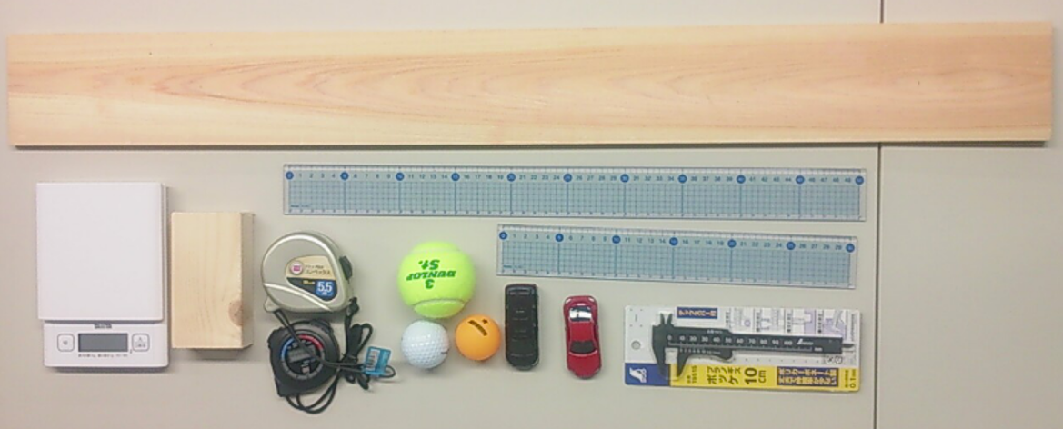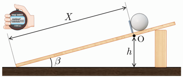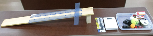 開始位置の高さ を変えながら,各種ボールが開始位置から下端まで斜面を滑らずに転がり落ちる時間をストップウォッチで測定する.