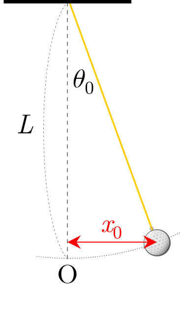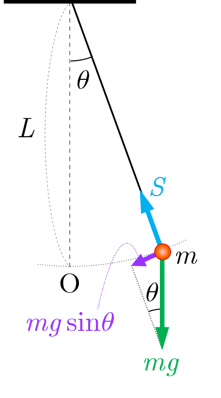 図のように,軽い糸の一端に質量 の小球をつけ,他端を支点に固定して振幅の小さな振動をさせる.ここで,小球の半径 と糸の長さ との和を単振り子の長さ とし,重力加速度の大きさを とする.また,小球を吊るして静止させたときの小球の位置を点 として,小球はこの点 を通る鉛直平面内を振動し,空気の影響は無視できるものとする.