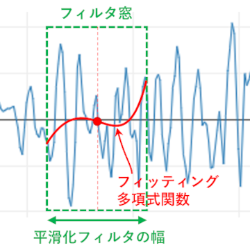 最小二乗近似による平滑化では,平滑化フィルタ窓内にあるデータに対して,最小二乗法を用いて多項式関数でフィッティングし,フィルタ幅の中央における関数値をその点の平滑化されたデータの値とする.フィルタ窓をデータの左端から右端にずらしていきながら,同様のフィッティングを行って,平滑化されたデータを得る.この方法は,測定データの時間刻み幅が常に一定であれば,Savitzky-Golay平滑化 2) と同じである.