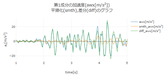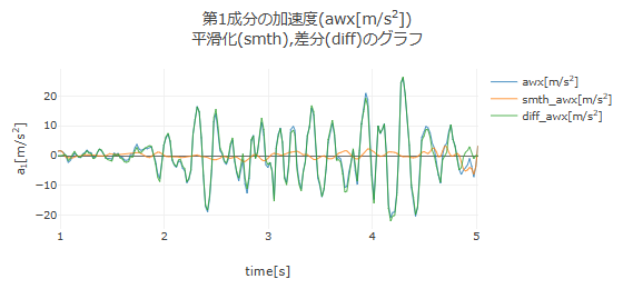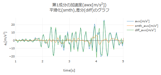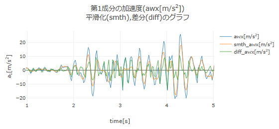 ここで,オレンジ線(smth_awx)が平滑化されたデータであり,緑線(diff_awx)は差分データ(元のデータから平滑化されたデータを引いたもの)を示す.平滑化されたデータのグラフ(オレンジ線)を見ると,細かい振動成分(ノイズ)が元のデータから除去されていることが分かる.