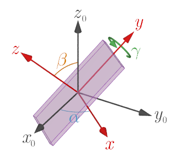 $$ \tag{1} R_z(\alpha)=\begin{pmatrix} \cos\alpha & -\sin\alpha & 0 \\ \sin\alpha & \cos\alpha & 0 \\ 0 & 0 & 1 \end{pmatrix} $$ $$ \tag{2} R_x(\beta)=\begin{pmatrix} 1 & 0 & 0 \\ 0 & \cos\beta & -\sin\beta \\ 0 & \sin\beta & \cos\beta \end{pmatrix} $$ $$ \tag{3} R_y(\gamma)=\begin{pmatrix} \cos\gamma & 0 & \sin\gamma \\ 0 & 1 & 0 \\ -\sin\gamma & 0 & \cos\gamma \\ \end{pmatrix} $$