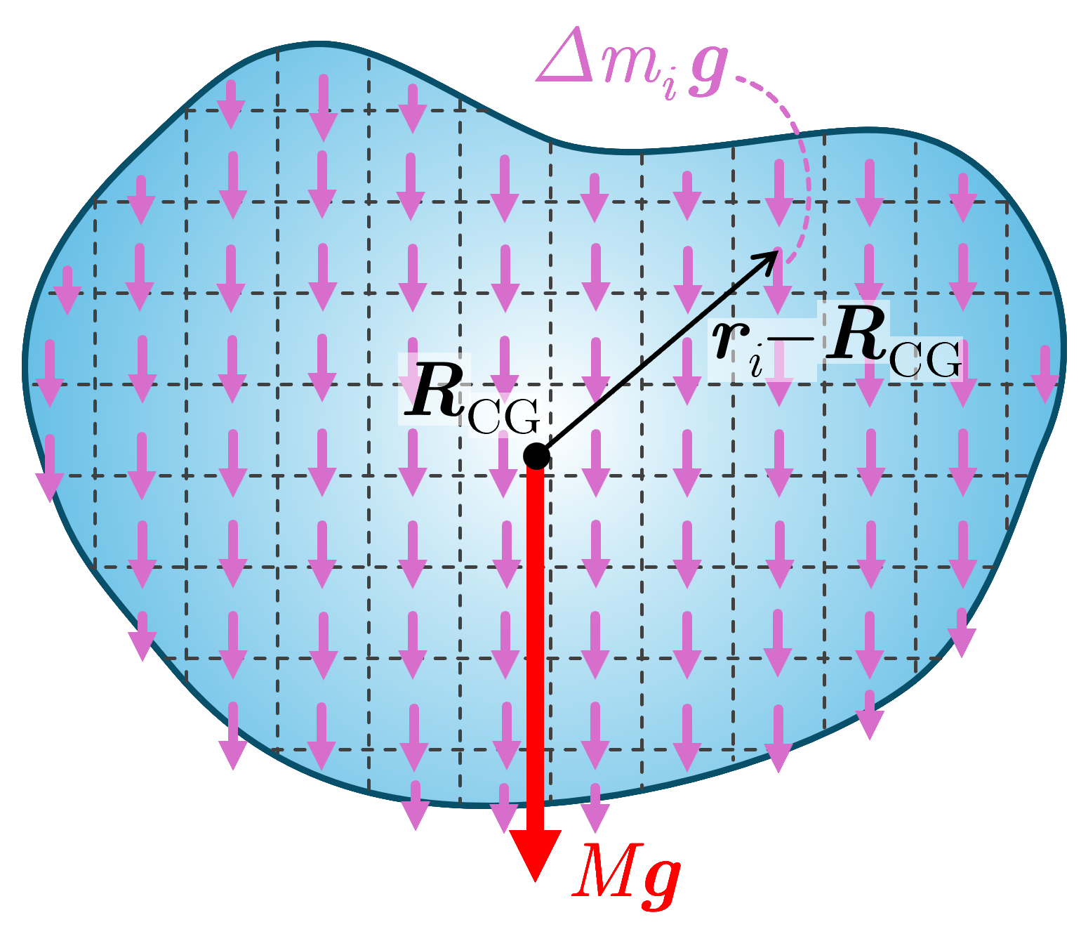 個の質点からなる質点系について, 番目の質点の質量を ,位置を とし,重力加速度を とすると,重心 のまわりの力のモーメント(トルク)のつり合いは