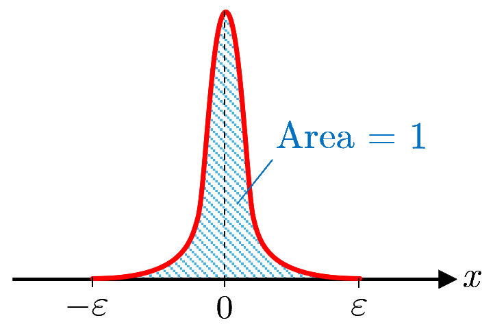 このデルタ関数は,質量が1点に集中した質点や電荷が1点に集中した点電荷,瞬間に発生するパルス信号などを表すのに便利であり,物理学や工学の分野でよく用いられる(制御工学ではデルタ関数のことをインパルス関数 (impulse function) という).式(1),(2)で定義されるデルタ関数は通常の関数とは異なりグラフで表すことはできないが,図1に示すグラフのようなイメージをもつと良い( はいくらでも小さくとれる).また,デルタ関数を初等関数で近似すると実際にグラフが描ける.