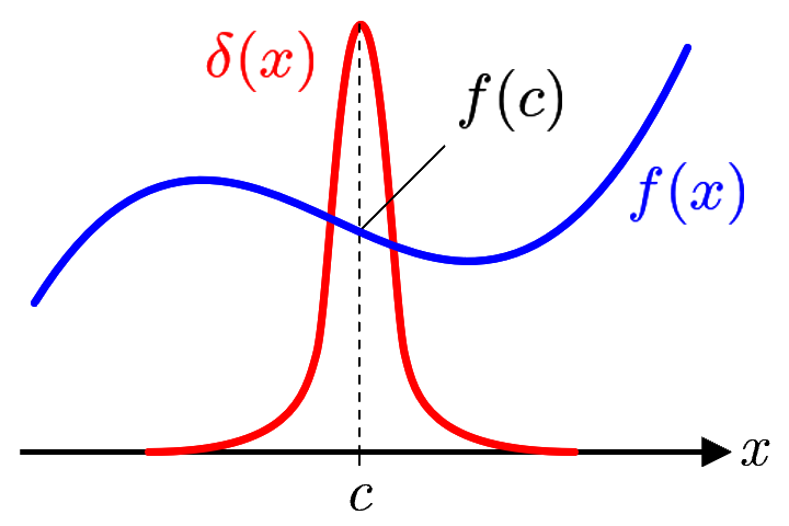 (定数)で連続でなめらかな任意の関数 とデルタ関数 を掛け合わして, を含む区間 で積分すると