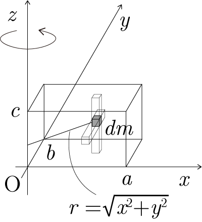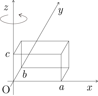 右図のような,密度が一様で,質量 M ,各辺の長さがそれぞれ a , b , c の直方体について, z 軸まわりの慣性モーメント I を求めよ.ここで,直方体は長さ c の1辺が z 軸に沿うように, xy 平面上に置かれている.