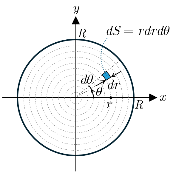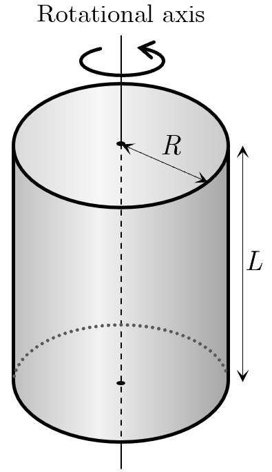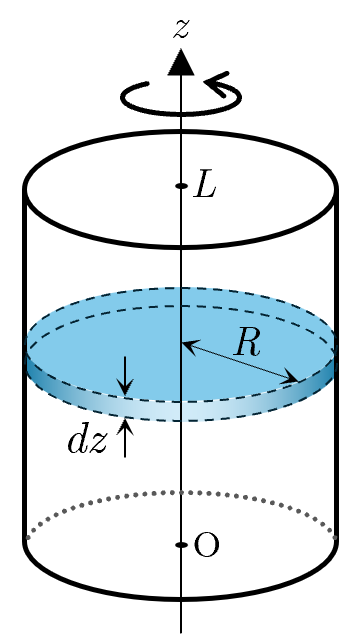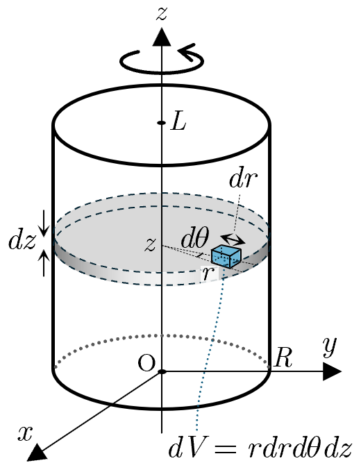 図に示すように,質量 M ,半径 R ,長さ L の密度が一様な円柱について,中心軸(円柱軸)まわりの慣性モーメント I を求めよ.