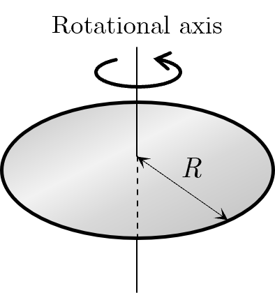 図に示すような,質量 M ,半径 R の密度が一様な薄い円板について,質量中心を通る回転軸のまわりの慣性モーメント I を求めよ.