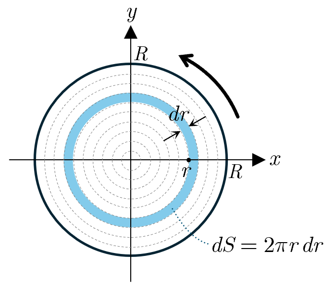 である.図のように,この円板を半径方向( r 方向)に微小幅 dr の円環に分割する.半径 r の円環の円周は 2πr であり,微小幅 dr の円環の面積は dS=2πr⋅dr と表せるので,この円環の微小質量が