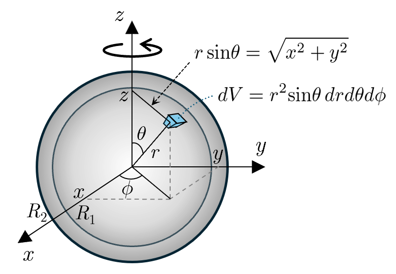 図に示すように,中空球を微小部分に分割し,極座標