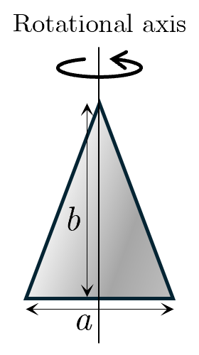 図に示すような,質量 M で密度の一様な二等辺三角形(底辺 a ,高さ b )の薄板について,頂点と質量中心を通る回転軸のまわりの慣性モーメント I を求めよ.