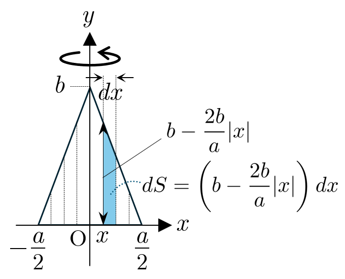 である.図のように,この薄板を x 軸方向に微小幅 dx の細長い長方形に分割する. x 軸方向の位置 x での微小幅 dx の長方形の長さは b−2ba|x| なので,この長方形の微小面積 dS は