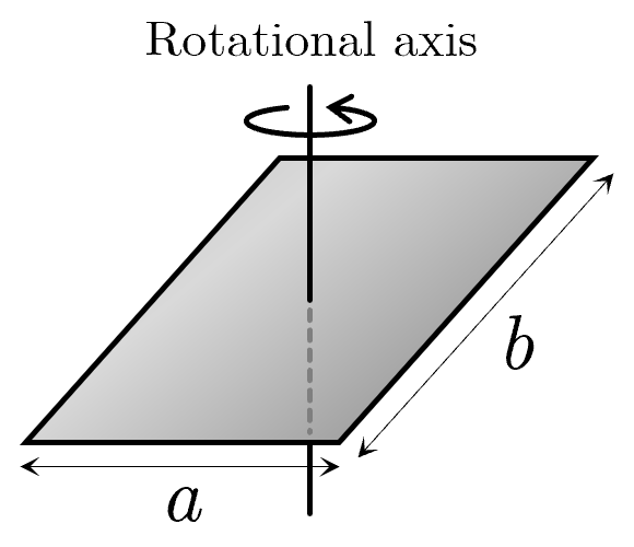 図のような,面密度が一様で,質量 M ,各辺の長さがそれぞれ a , b の矩形板(長方形の板)について,質量中心を通り,板面に垂直な回転軸まわりの慣性モーメント I を求めよ.