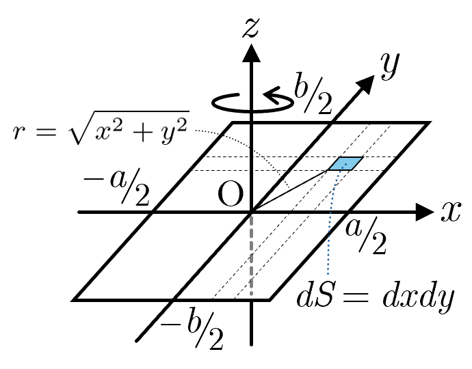 と表される.微小部分の回転半径は r= x 2 + y 2 であり, xy 面における積分範囲は −a2≤x≤a2 , −b2≤y≤b2 である.よって, z 軸まわりの慣性モーメントは