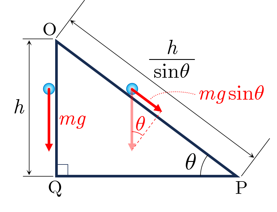 保存力のする仕事の例として,図2に示すような水平面に固定された傾斜角 ,高さ の斜面台において,質量 の小球が斜面上端の点 から斜面下端の点 に移動するときの,小球にはたらく重力のする仕事を考える.重力加速度の大きさを とすると,斜面に沿って点 から点 まで移動する経路では,小球にはたらく重力の斜面方向成分が であり,移動距離が なので,重力のする仕事は
