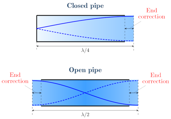 閉管 (closed pipe) では開いている側の端で,開管 (open pipe) では両端で,開口端補正を考慮する必要がある.また,開口端補正は近似的に管の半径に比例し,通常,常に一定とみなして考えることが多い.